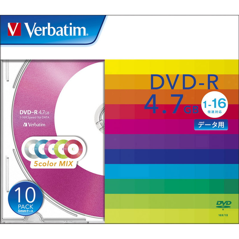 DVD-R(Data) 4.7GB 1-16倍速 1枚ケース(白)10P 5色