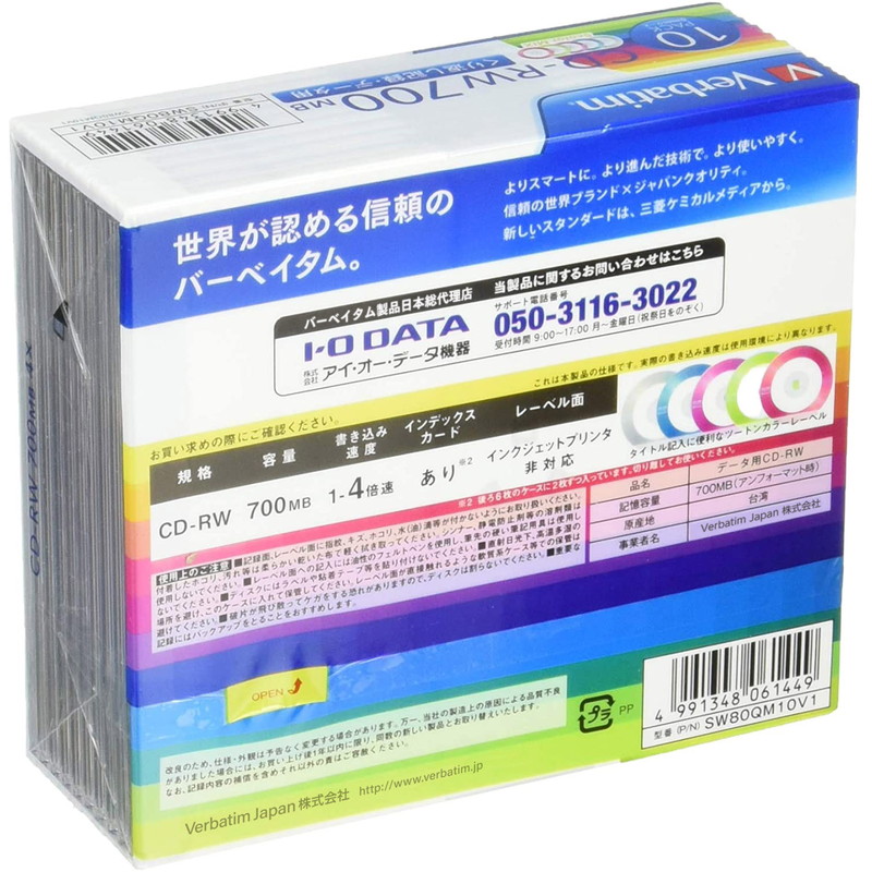CD-RW(Data) 700MB 1-4倍速 1枚ケース(白)10P 5色