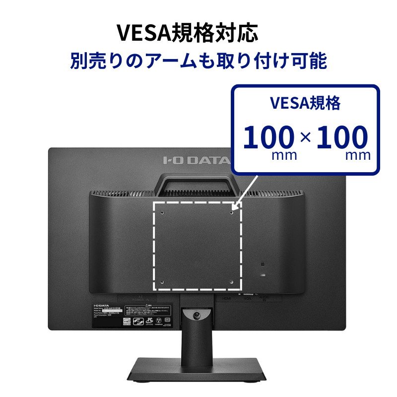 また、付属のスタンドを使えば、モニターの角度を上下に調節可能ですし、VESA規格にも対応しているので、別売りのモニターアームを取り付けて、モニターの角度や位置を自由に調節して使うこともできます。