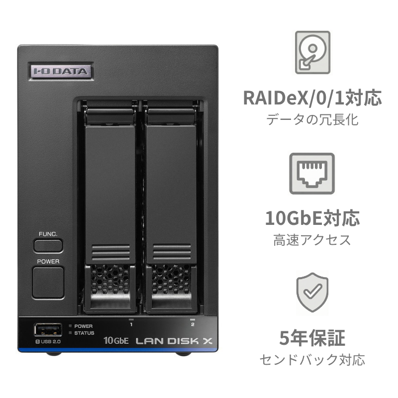 同容量のHDDを2台搭載し、データを二重化することで冗長性を担保する「RAIDeX」(レイドエックス)に対応しており、万が一片方のHDDが故障した場合でも、運用を止めずに交換することができます(※このため、実際にデータ領域として使える容量は、製品容量の2分の1となります。他、RAID 0/1にも対応)。その他、