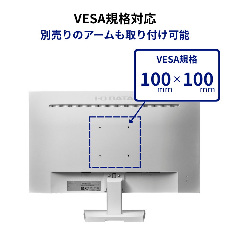 また、付属のスタンドを使えば、モニターの角度を上下に調節可能ですし、VESA規格にも対応しているので、別売りのモニターアームを取り付けて、モニターの角度や位置を自由に調節して使うこともできます。