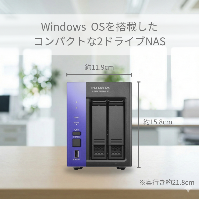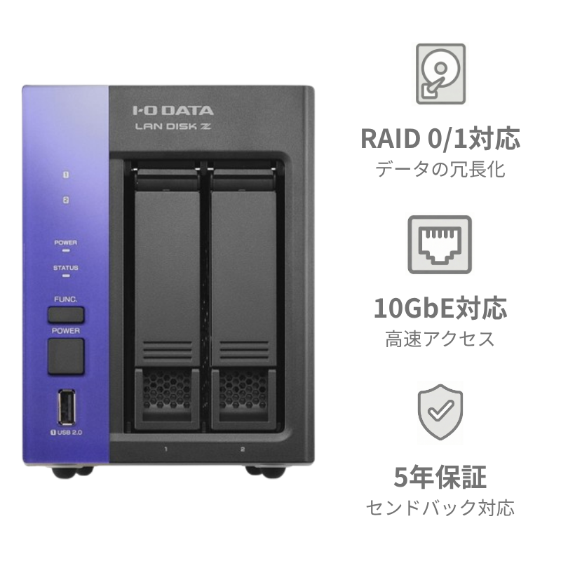 という特長を備えた法人向けNASです。「LAN DISK Z」は、当社NASラインアップのうち「Windows OSを搭載したシリーズ」を指しますが、中でも本機種は「Atomを搭載した2ドライブNASのうち、リーズナブルなスタンダードモデル」です。