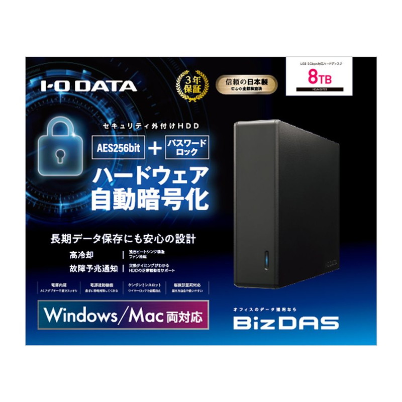 USB 3.2 Gen1対応 セキュリティハードディスク 8TB(パスワードロック/ハードウェア暗号化対応)【Mac OS対応】