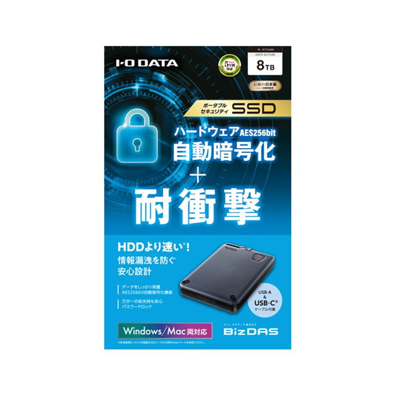 USB 5Gbps(USB 3.2 Gen1)対応 長期5年保証 セキュリティポータブルSSD 8TB