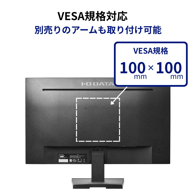 また、付属のスタンドを使えば、モニターの角度を上下に調節可能ですし、VESA規格にも対応しているので、別売りのモニターアームを取り付けて、モニターの角度や位置を自由に調節して使うこともできます。
